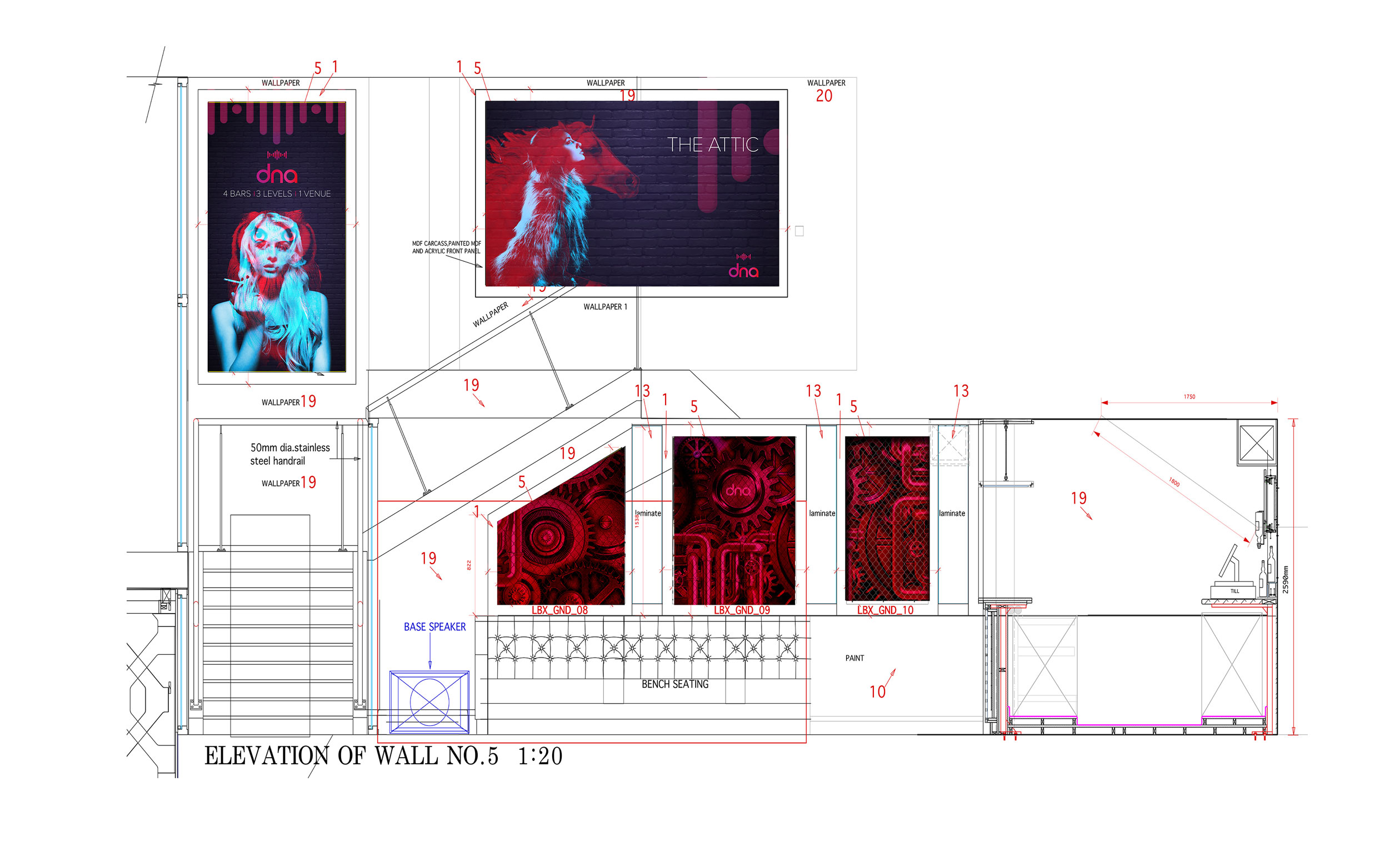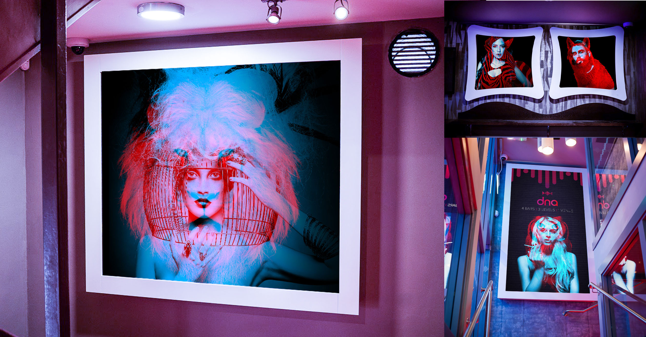 Working alongside a specialist interior designers and printers we decided early on that large scale light-boxes where to feature heavily in the interior design. Using inspiration that was inspired by everything from French avantgarde photography, geometric patterns, the human body, animals and industrial and music elements, I designed a series of largescale lightbox artworks and graphics that would work within the venue.