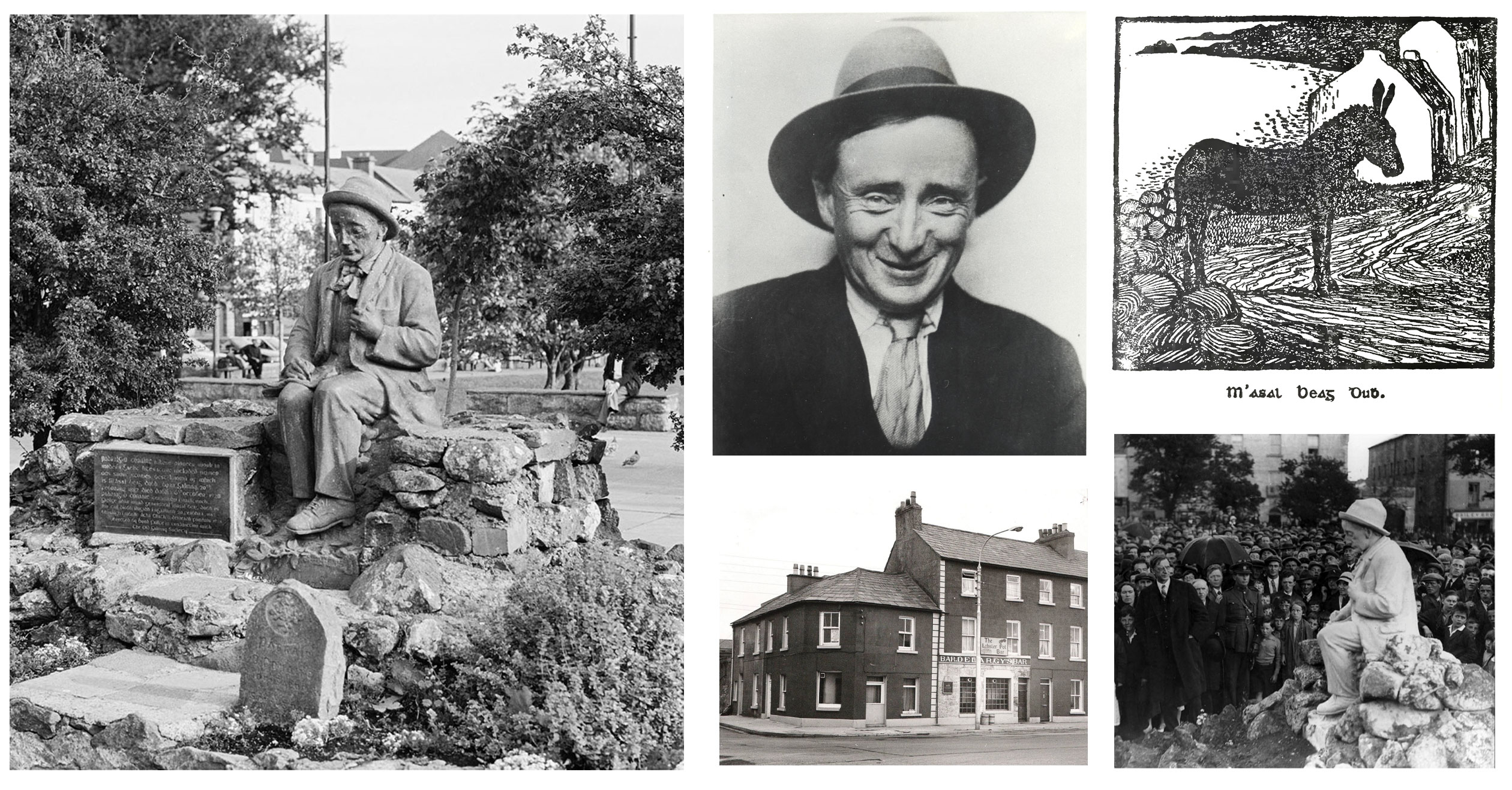The famous statue of famous Galway poet and writer Pádraic Ó Conaire (1882 – 1928) sits in a park outside of the Skeffington Arms. This proved suitable and appropriate inspiration for the final logo. Many Irish student would know his work from his comedic Irish language book ‘M’asal Beag Dubh’ (My little Black Donkey). The image of the black donkey featured heavily in the pre-launch and launch posters.